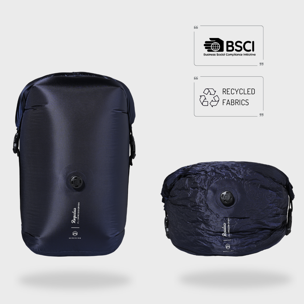 Hitze- und kälteresistente Woojin® Schnallen, sowie ultraleichtes, recyceltes Robic® Performance Nylon machen diesen Dry Bag mit Ventil zu einem leichten und nachhaltigen Partner, der dich viele Jahre begleiten wird.